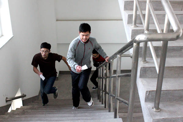本次比赛共有86位选手参加,每组3人同时由工科楼第一层出发,通过爬楼梯的方式到达顶层,所用时最少的选手将获得一等奖励。为确保选手竞赛途中安全,同时防止乘坐电梯等作弊现象发生,电气1402班在每两层楼梯处都安排了监督人员,以确保比赛的公平公正。