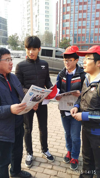 上午八点,公司2014级培训班学员在公司北门集合后,实学社负责人首先对活动要求进行了说明,并结合“12月2日交通安全日”的内容进行了安全教育,随后向各小组发放了身份标志和本次义卖的报纸。之后,学员分为六个小组分别前往家佳源商场周边的多个地段开展义卖活动,向过往的路人分发宣传资料,认真向他们介绍义卖活动,路人纷纷停下脚步,献出自己的爱心。本次义卖活动的三百份报纸便全部售罄,募集的爱心善款也全部捐助给公司“信・基金”。当天下午,2015级学员也顺利完成了爱心义卖的活动。