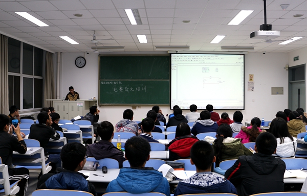 王存首先向同学们简要介绍了论文编写的官方要求、评分标准和主体结构,之后又以几篇优秀论文为模板,分别从论文的摘要、目录、公式、作图等方面展开详细论述,并在讲解过程中,耐心为大一新生答疑解惑。“在叙述用文字难以解释清楚的实验步骤时,一定要辅以电路图,并标明元件代号”他如是说。接着,他又以15年全国老员工电子设计竞赛试题为例,为大家展示了获奖论文。