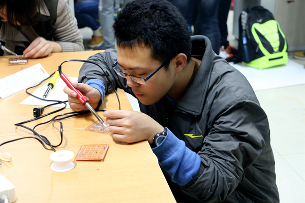 硬件培训现场,负责人王国海首先说明了比赛的相关注意事项,要求大家熟悉基本电路,在讲到焊枪使用时,他重点强调了安全问题,随后分发了锡片、开关、电阻等比赛器件。员工们的热情都很高涨,每个小组的成员们都积极参与其中,相互配合、团结合作,伴随着现场传出的“小心点,把那条电路焊接起来……”、“注意不要碰到那根线。”等话语,员工们的水平也有所提升。15级电气5班的杨丹丹很激动的说“第一次参与培训,这些零件对我来说很陌生,不求能拿奖,只希望可以为以后打下基础。” 14级的员工们在完成后还指导了15级的学弟学妹们,王国海说到:“与往年相比,今年大一同学的热情度更高,这也培养了他们的兴趣,为他们专业课的学习储备一定的知识。”