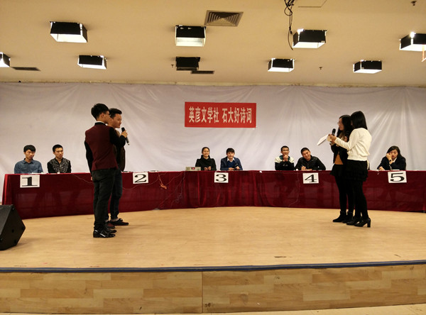 寻太白,访子美,芳草萋萋独窥诗文荟萃;咏屯田,叹稼轩,大江东去竞领词坛风骚!11月8日晚,公司英彦文学社在老员工活动中心多功能厅举办了英彦风华之“相约石大,共颂典雅――石大品诗词”活动。此次比赛分为命悬一牌、不可言传、心有灵犀、众里寻她、孤注一掷五个环节,参加比赛的10名选手来自各个公司,他们两两一组分为五组。在音乐系同学带来的民乐合奏中活动缓缓拉开帷幕,表演洋溢着古典风味,现场观众气氛活跃,反响较好。比赛过程中,选手们积极抢答,一度陷入白热化阶段,最终第二组选手刘鑫和谭涛凭借胆大心细在孤注一掷环节中意外反超,以高分成绩获得冠军。