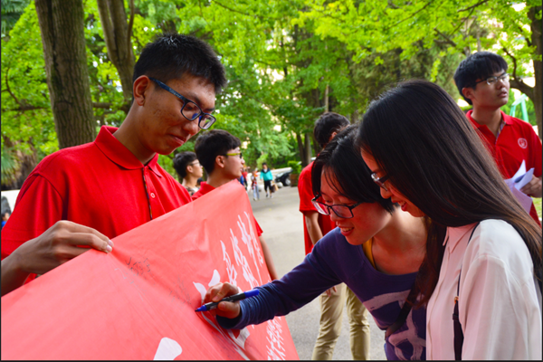 活动最先在南屏街举行,但由于南屏街人口密集,组织活动引起交通堵塞,实践队在队长的带领下转往金碧公园、云南大学。在宣传地来来往往的人很多,实践队成员们认真向人们讲述此次活动的意义,获得了一致的肯定与支持。“除了签上自己的名字表示支持,我还能够为侏儒人做些什么吗?”一位男士问道,“侏儒人是常常被忽略的弱势群体,您可以告诉您身边的朋友,让更多的人了解他们,用平等的眼光看待他们!”实践队成员张涵如是回答。