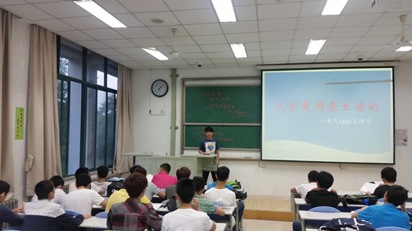 电气1303班团支书刘赛伟首先对公司的助学贷款政策进行了一系列解读,并对班级获得助学金以及助学贷款同学的表现进行了点评,鼓励同学自强不息、艰苦奋斗,学好专业知识从而在今后回报社会。他还结合自身经历,劝诫同学时刻不忘目标,不轻易放弃,提高自制力,为自己的理想不断奋斗。之后,电气1303班班长尚辉结合班级现实情况,回顾了班级近两年的精彩,同时提出“存在即价值”观点,乐观对生活,在困难时刻不灰心,有坚持下去的勇气。电气1304班长王宁化用“一叶障目不见秋”一句,告诫同学们不要因为眼前的名利而忘记了自己的理想,劝诫同学们禁得住诱惑,争取更高的追求。最后,现专业第一常铮同学介绍了一些学习经验,强调同学少玩游戏多上自习,大家不约而同的点头认同。