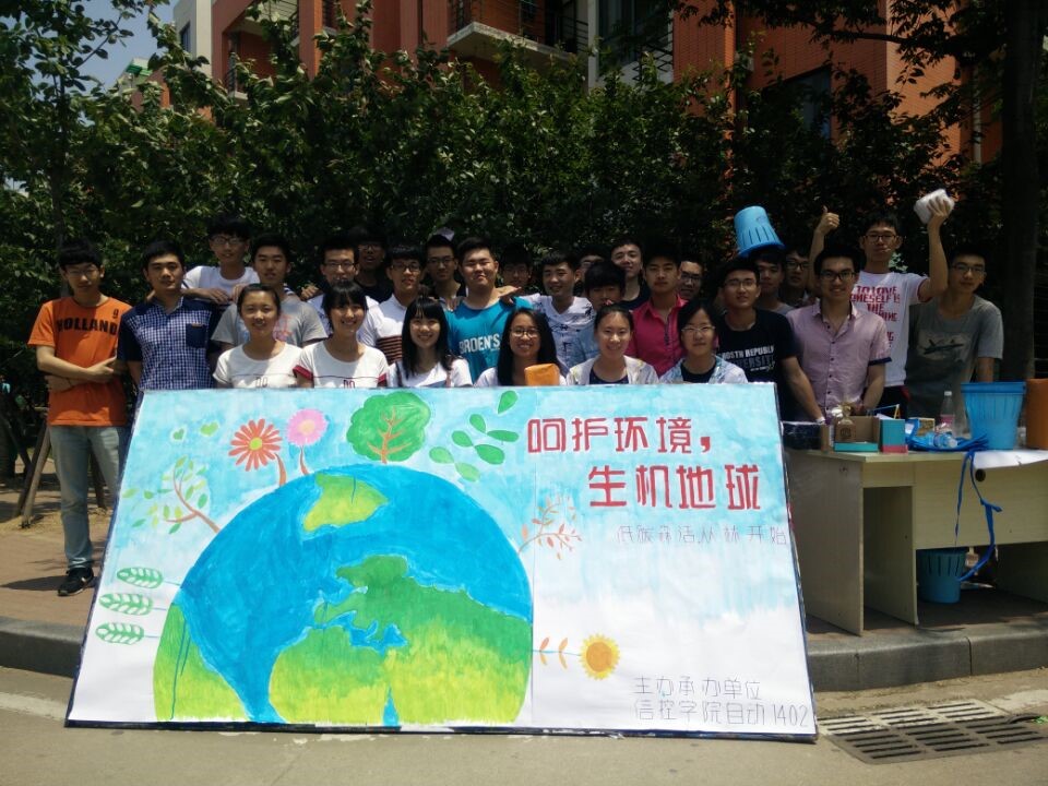 2015年6月5日,自动化1402班全体同学在班长刘浩宇以及团支书王萌的带领下,在荟萃广场举办了主题为“呵护环境,生机地球”的团日活动。
