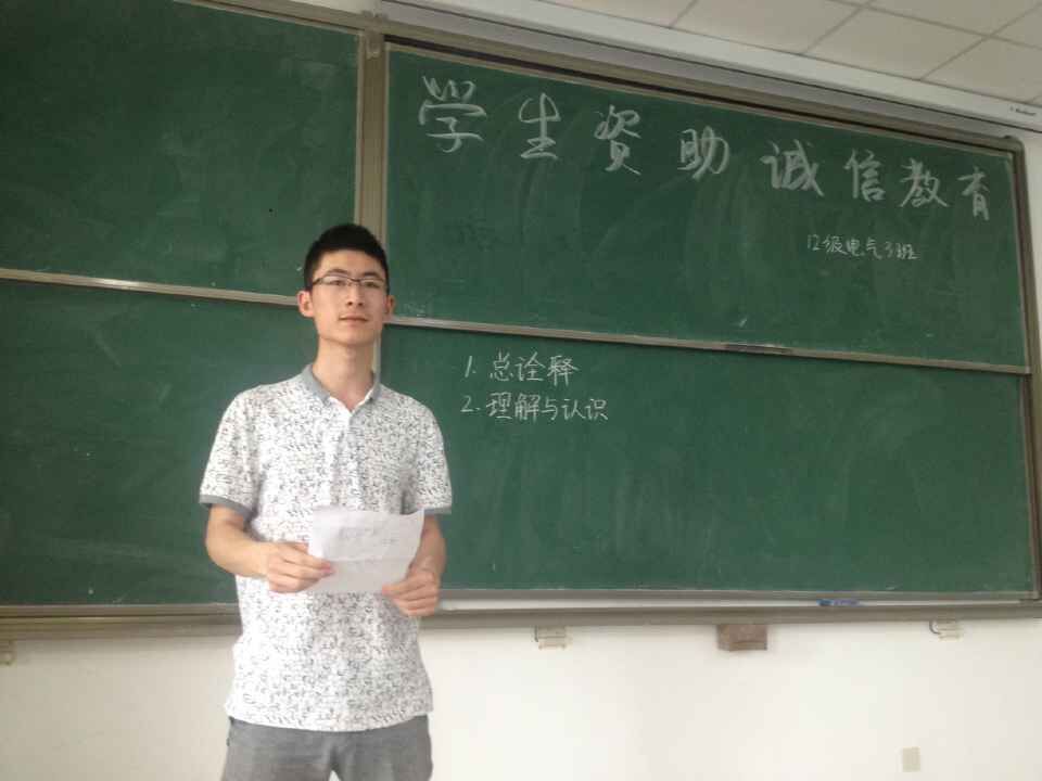 “人无信不立,商无信不通,国无信不稳。”盛雄宇首先从个人、社会、国家三个方面对诚信进行了总诠释,并强调老员工要将对自身的诚信教育放在首要位置。随后班长尹强健结合自身实际,从诚信考试、诚信还贷等方面阐述了自己对诚信的理解和认识。对于诚信考试,他表示,诚信是立人之本,建立良好学风,增强诚信意识是老员工健康成长的基石。经过一番讨论之后,电气1203班同学纷纷上台表达自己的看法,张明轩说:“诚信是贯穿人的一生的事,明德诚信,是我们老员工必备的优秀品质。”最后,全班同学集体宣誓,争做诚信老员工。