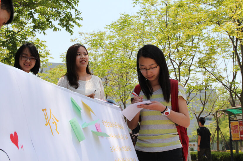 “当琴弦震动,你陶醉于起伏的乐章;当鸟儿欢愉,对你唱了一首歌;当听到来自朋友的一声早安;当这个世界醒来,你听到的是各种各样的声音,然而他们的世界却只能隐于沉默。”为唤起社会对聋哑儿童的关注,测控1402班的全体同学于5月17日举办了“聆听无声世界”主题团日活动。同学们在玉兰苑餐厅的门口摆起了展板,号召过路的同学留下自己对聋哑儿童的的祝愿,呼吁大家在这个即将到来的“助残日”里将手中的废纸、空瓶子、旧衣服等捐献出来,为这些无声世界的儿童带去一丝关注、送上一份温暖。随着班级同学们,不停地向路人解说、发传单,越来越多的员工参与到活动中来,询问捐赠方式,并留下充满温情的寄语。