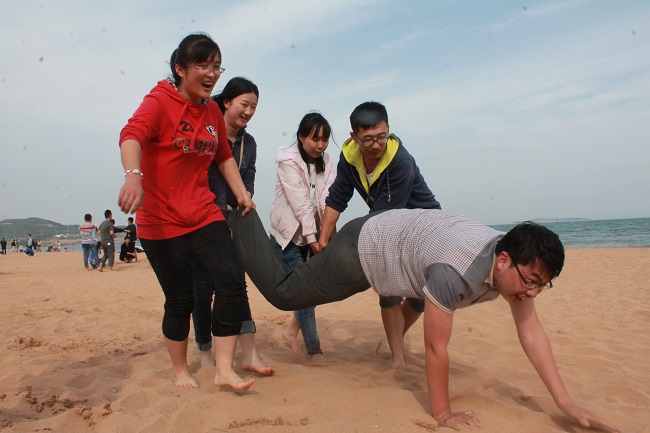 在到达金沙滩各个公司完成报道后,大家便分别在沙滩上开始进行团体游戏。李建伟和魏炯带领着大家首先进行了“吹大风”的游戏。大家光着脚丫在沙滩上站成一圈,随着“大风吹,吹什么风”的口号不断交换位置,最慢的同学站在中间进行自我介绍并进行下一次喊号。生动有趣的方式让整个队伍迅速相互进行了认识。接着又进行了“排火车”、“鸡蛋-小鸡-大鸡”等游戏,每个游戏完毕后,失败者都要接受惩罚,并总结自己的失败原因,成功者则介绍成功经验。有趣的游戏过程却蕴含着简单深刻的道理:“排火车”教会大家合理利用每个的优缺点进行任务分配,“鸡蛋-小鸡-大鸡”告诉大家要想成功就要不断尝试。