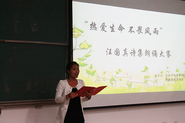 为纪念逝世诗人汪国真,公司电子1301班与朗诵爱好者协会联合举办“热爱生命、无畏风雨――汪国真诗集朗诵比赛”,比赛于5月10日晚7时30分在南教114举行,公司副教授刘广孚、13级辅导员王宁以及朗诵爱好者协会会长陈凯作为评委应邀出席。