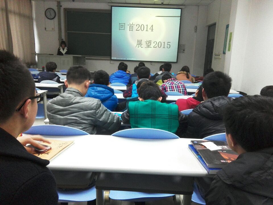 班会在学习两会概况中拉开序幕,员工们通过新闻报道来了解两会焦点问题,增长跟两会相关知识的储备。新学期亦是新的起点,在“两会”知识学习后,由班长张郅琦进行题为“总结2014,规划2015”的汇报。他通过对2014年班级期末考试成绩的分析,以及与兄弟班级的优秀率、及格率和学分拖欠等情况的对比,总结2014学年班级同学的生活及学习状况,同时展示2015年班级工作计划,对新学期总体规划作出要求,并鼓励大家新学期要有新计划,朝着新希望前进。班会最后为大家提供展示平台,在任伟、庞启华等人的寒假小作业“总结2014,规划2015”的个人报告中班会走向结尾。