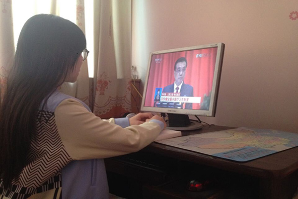 在校研究生观看李克强总理做政府工作报告(摄影:李雪银)