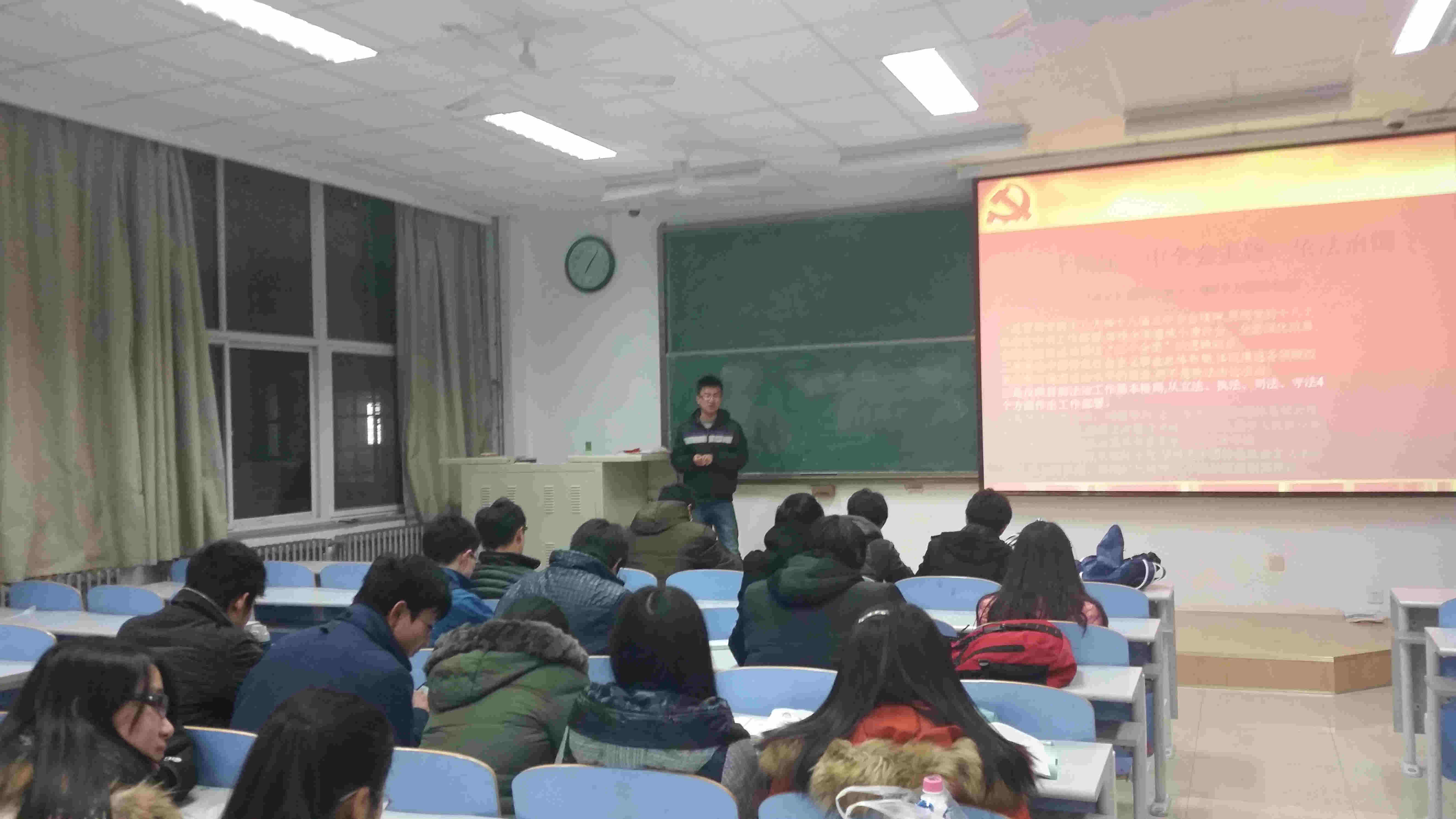 会前,刚刚结束入党积极分子党校培训学习的同学向全体同学传达了党课学习中关于十八届四中全会精神的相关内容,并带领同学们通过微博发表了自己对会议精神的认识和想法。本次主题团日活动一方面是对前一阶段学习的总结,另一方面也让全班同学更加细致地认识宪法和学习依法治国战略。