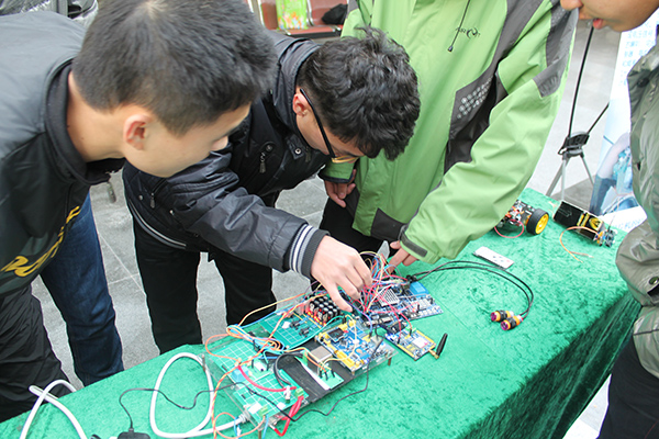 展示现场,获得电子设计竞赛一等奖及二等奖的员工检查调试自己的电子设计作品后,向在场的其他作品负责人和前来观看的同学们细致讲解了自己作品的设计理念、核心技术,并演示了其操作和运行过程。其中,利用快速傅立叶变换,实现220v单项交流电电压电流频率功率因数检测的装置、基于纯硬件电路的流水灯、基于单片机原理的万年历和温度报警装置等优秀作品令人印象颇深。