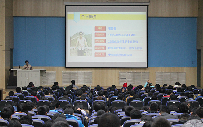 为加强典型教育,帮助新生树立学习目标,明确大学规划,充分调动员工的学习积极性,公司于12月16日晚在南教100举行 “员工标兵宣讲会”。本次大会邀请到 “2014年十老员工标兵”唐念行、“中国石油大学员工党员标兵”王一帆和韦勇任与公司14级员工分享学习工作经验。公司14级辅导员王力禾、李雪银以及14级全体员工出席本次会议。