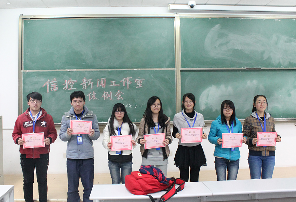 会上首先聘任了杨培培等14名成员为新闻工作室本学期首批正式员工记者,王力禾为员工记者颁发了记者证和聘书。随后,会议对在近期新闻宣传工作中表现突出同学进行了表彰,陈怡然等4名同学被评为11月份新闻宣传工作月度先进个人。会上还对新媒体建设、对外宣传、技能培训等工作进行了部署。