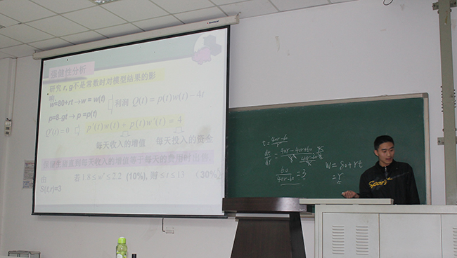 培训伊始,李广琛首先向大家出了一道数学趣味题,告诉大家枯燥的数学也可以变得生动有趣,大家积极讨论,使得接下来培训的过程变得轻松活跃起来。之后李广琛对“猪的最佳出售期”和“森林救火人员的数量配备”两个典型的数学建模问题,向大家做了详细的解析步骤说明,并鼓励大家要打开思维,合理而大胆地对问题作出假设。最后大家就培训过程中遇到的不懂的地方与学长进行交流,李广琛和高旭对其疑难问题进行了一一解答。