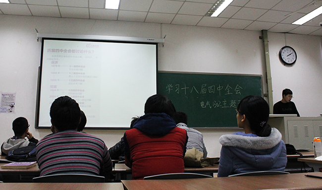 为响应团中央号召,组织引导广大团员青年认真学习宣传贯彻党的十八届四中全会精神,12月6日下午2点,电气1302团支部于南堂112举办“我的共产党,我的中国梦”主题团日活动。