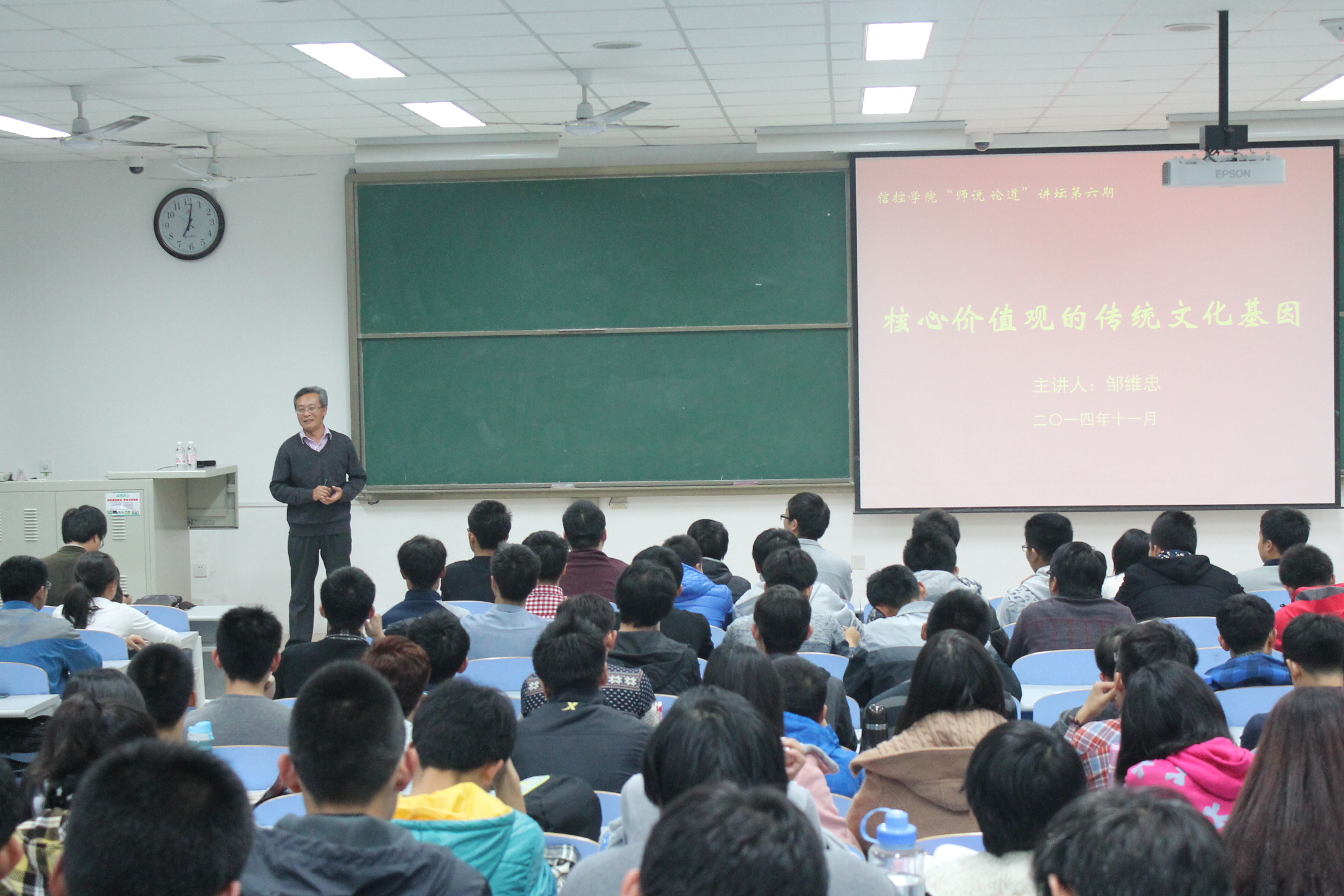 11月21日,公司“师说论道”讲坛第六期于南教楼202教室举行,本次论坛特别邀请党委员工工作部副部长邹维忠为公司员工做了题为《核心价值观的传统文化基因》的专题报告。公司团委书记赵小明,各年级辅导员,以及13 、14级全体员工干部和党员听取了报告。