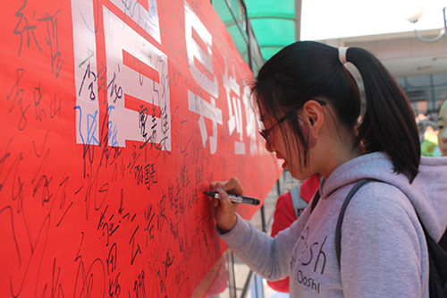 活动主要包括将垃圾分类投箱、在横幅上签名、贴感想纸条和抽奖等环节。活动中,班级同学扮成“分类垃圾箱”向路过的同学宣传环保理念和垃圾分类方法。班里同学制作了代表各类垃圾的小卡片,又用废旧纸箱制作了小小垃圾桶,分别代表可回收垃圾桶或不可回收垃圾桶。参加活动的同学在工作人员的生动易懂的简单培训后,纷纷将小卡片制成的各类“垃圾”的投入到对应的“垃圾桶”内,正确投放者即赢得抽奖机会。不断有刚刚下课的同学加入到活动中,越来越多的“垃圾”被投入正确的“垃圾桶”内,而在现场的另一边写有“倡导垃圾分类,共创美丽校园”横幅上和垃圾分类宣传展板上也满满的留下了同学们的签名和环保小建议。