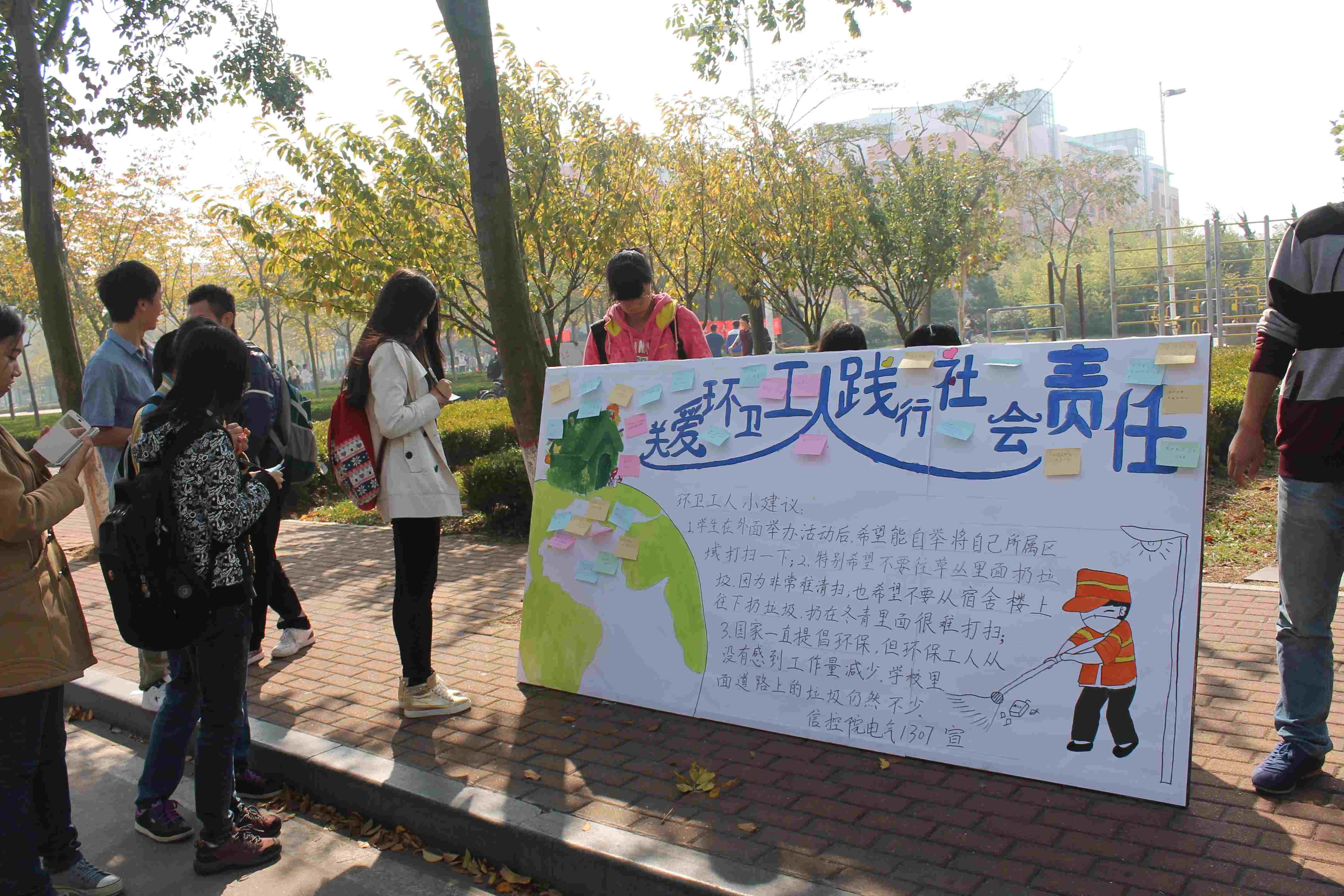 本次团日活动包括校内环卫工人采访以及校园展板成果汇报两部分。同学们自行组队,通过采访校园以及教室清洁工人工作细节的方式,积极了解环卫工人的工作、生活情况,并结合实际,总结出了一些小建议,通过展板呈献给大家。本次活动增加了同学们对环卫工人的了解,同时呼吁广大同学关注环卫工人,增强了同学们的责任意识、环保意识。据团支书介绍,本次主题团日活动一方面要落实“关爱环卫工人,践行社会责任”的主旨,另一方面要发动广大同学为深入践行“社会主义核心价值观”贡献自身力量。