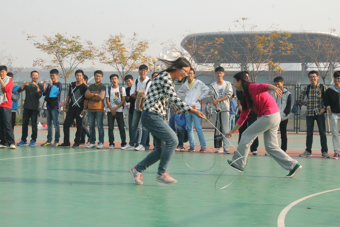 本次趣味运动会包括传统的“转呼啦圈”“滚铁环”“两人三足”比赛和带有现代气息的“夹气球”“火车快开”等趣味项目。随着一声哨响,转呼啦圈比赛拉开了趣味运动会的序幕。各项活动的依次进行着,同学们积极参与,掌声、笑声、加油声,此起彼伏,回响在整个篮球。场上场下互动交流频繁,整个比赛过程充满了愉悦的气氛。随着运动会逐渐接近尾声,“火车快开”将全场的氛围推向高潮。大家齐心协力,互相配合,伴随着“一二一 一二一……”的喊声奔向终点。