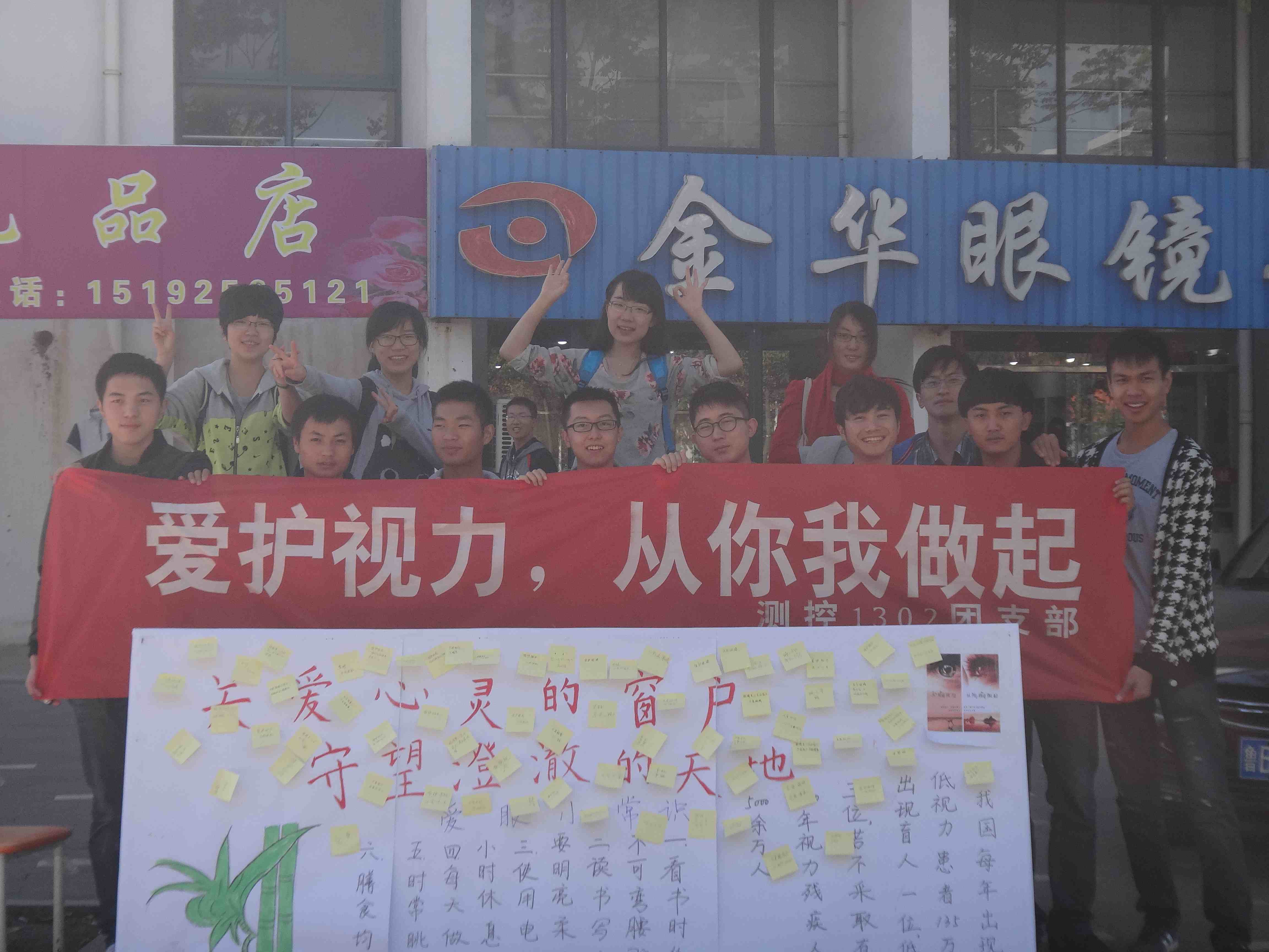 目前,我国有单项视力残疾人1263万,兼有其他残疾的视力残疾人468万。视力退化现象逐年加剧,戴眼镜人群日趋低龄化,视力问题亟待社会关注。活动前期,测控1302班的同学们积极准备,精心制作宣传海报,张贴于各宿舍楼下;同时绘制了精美的展板,在进行展板宣传时,向同学们生动介绍了我国目前的总体视力现状以及如何处理与盲人相处中的一些注意事项,如何更好尊重、帮助他们等,并且向同学们介绍了爱眼护眼的一些日常小知识。在活动现场,至少200人积极参与到本次活动中来,送上真诚的寄语,表达对盲人的关爱和祝愿以及对爱眼小知识的肯定。团日活动还与眼镜店联手,向同学们免费发放眼镜布,参与者可以到眼镜店免费清洗眼镜,参加本次活动的同学都很支持。“盲人需要关爱,身边的人需要关爱,不论是不是特殊节日,我们都要把这份爱传递下去,对每一个人。当你惊诧于世界的五彩斑斓,有人却一直活在黑暗中。无论哪一天,我都愿与你共享一双明眸,共看一轮明月”,活动负责人曹洪尧如是说。