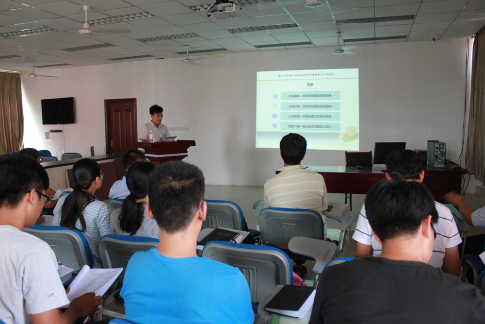辅导员孟兆刚就老员工科技创新工作体系――科技创新“ABC”计划的运行情况、创新创业项目规划、网络平台建设等面临的机遇和挑战进行分析和说明,同时对未来公司老员工科技创新的发展规划做进一步阐述,形成各年级共识。辅导员蒋仁福针对公司优良学风体系建设和学籍处理工作,对比近几年学风建设取得的成绩,分析了进一步加强和实施学风质量工程建设的重要意义,并就实施学风预警和学籍处理等具体工作同与会人员进行了交流。辅导员王力禾针对公司文化建设和新闻宣传工作提出下一阶段的具体工作思路和实施方案。