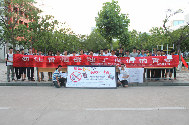 为了迎接“世界无烟日”的到来,普及吸烟危害,号召广大同学远离香烟,追求健康生活,5月28日下午5:30,电气1305班于在荟萃广场开展“勿让香烟侵蚀了你的青春”主题团日活动。