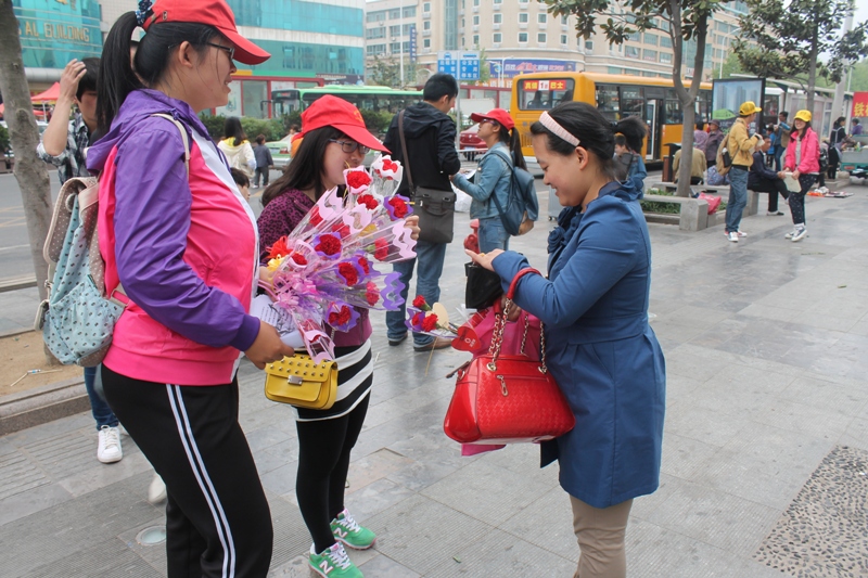 中午时分,同心圆暑期支教队准时从北门出发,到达利群商场后,队员们将事先包装好的康乃馨在各街道进行义卖。他们边向过往的路人宣传山区孩子生活条件的艰苦,边分发宣传资料介绍义卖活动,号召大家献爱心、送温暖。路人纷纷停下脚步,为贫困山区孩子们献出自己的一份爱心,国外友人也加入了购买行列。五元、十元、二十元……虽然金额不大,但都表达着自己对母亲的感恩,对山区孩子的关心。据悉,前期的义卖活动共售出二百余枝康乃馨。