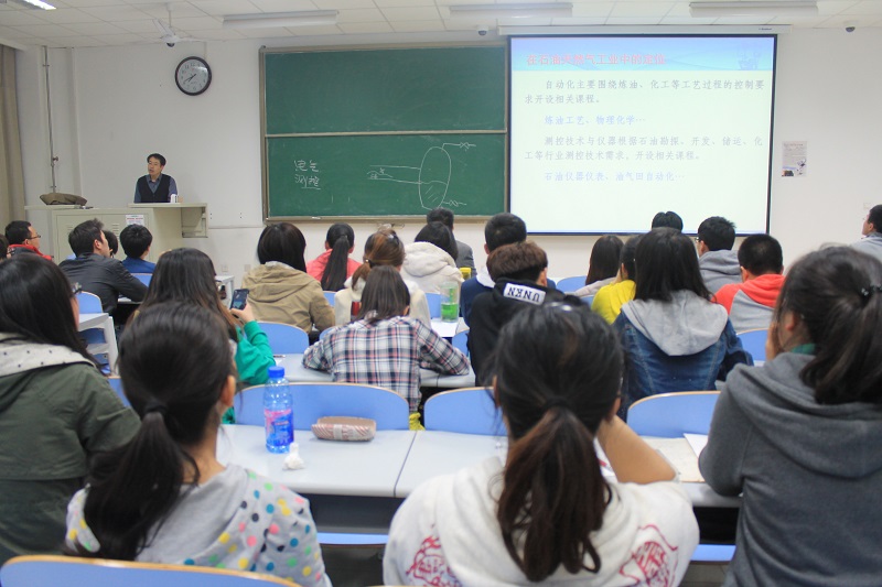 耿经理首先从“公司认知”、“专业认知”两方面向同学们介绍了公司发展历程和测控专业背景。随后耿经理分别从测控技术及测控系统、油气田测控技术、测控系统中的网络技术与通讯技术、如何开展老员工创新创业实践和学术活动、老员工学习方法、就业考研问题以及海外测控专业的教育现状等方面对专业进行了全方位的阐述。接着,华陈权老师对挑战杯、西门子杯工业自动化挑战赛、电子设计竞赛等专业比赛进行了系统的介绍,鼓励员工积极参加学科竞赛,夯实专业基础。在问答环节,同学们纷纷从就业方向、学习方法、考研经验等方面向老师们进行了请教,进一步增强了个人专业认同感和职业发展认知。耿经理说:“就业很重要,专业也很重要,做你自己喜欢做的事最重要。”一席话赢得了在场同学热烈的掌声。