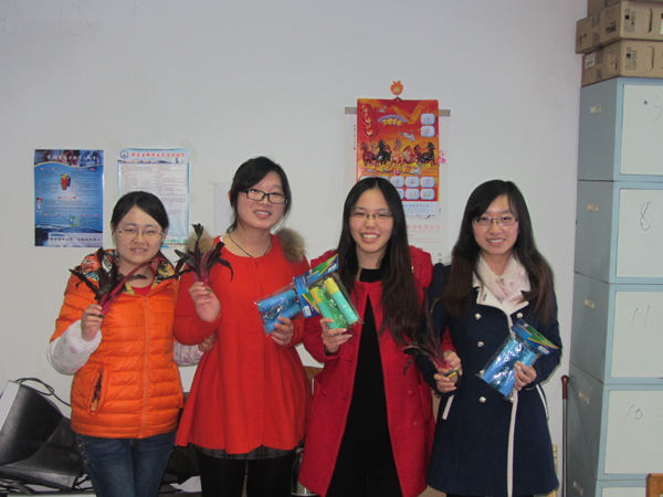 实验室女研究生们展示礼物 摄影:殷铭泽