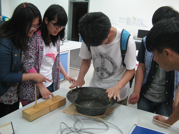 在实验室里,大家在老师的带领下参观了进动仪、离心力演示、角动量守恒演示等多种实验现象,并亲自动手尝试进行实验。其中许多实验现象令同学们十分惊异,大家纷纷向老师提出问题,在老师的耐心解答下,同学们了解了许多实验原理,如椎体上滚现象中的能量最低原理,伽尔顿板现象中的正态分布曲线等。