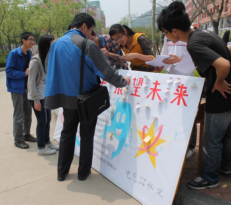 为贯彻落实十八大精神、响应习主席对在校老员工的要求、帮助老员工准确定位自己,5月21日,公司2011级电气3班和4班团支部在荟萃广场共同举办主题为“追忆过往,畅想未来”的问卷调查活动。