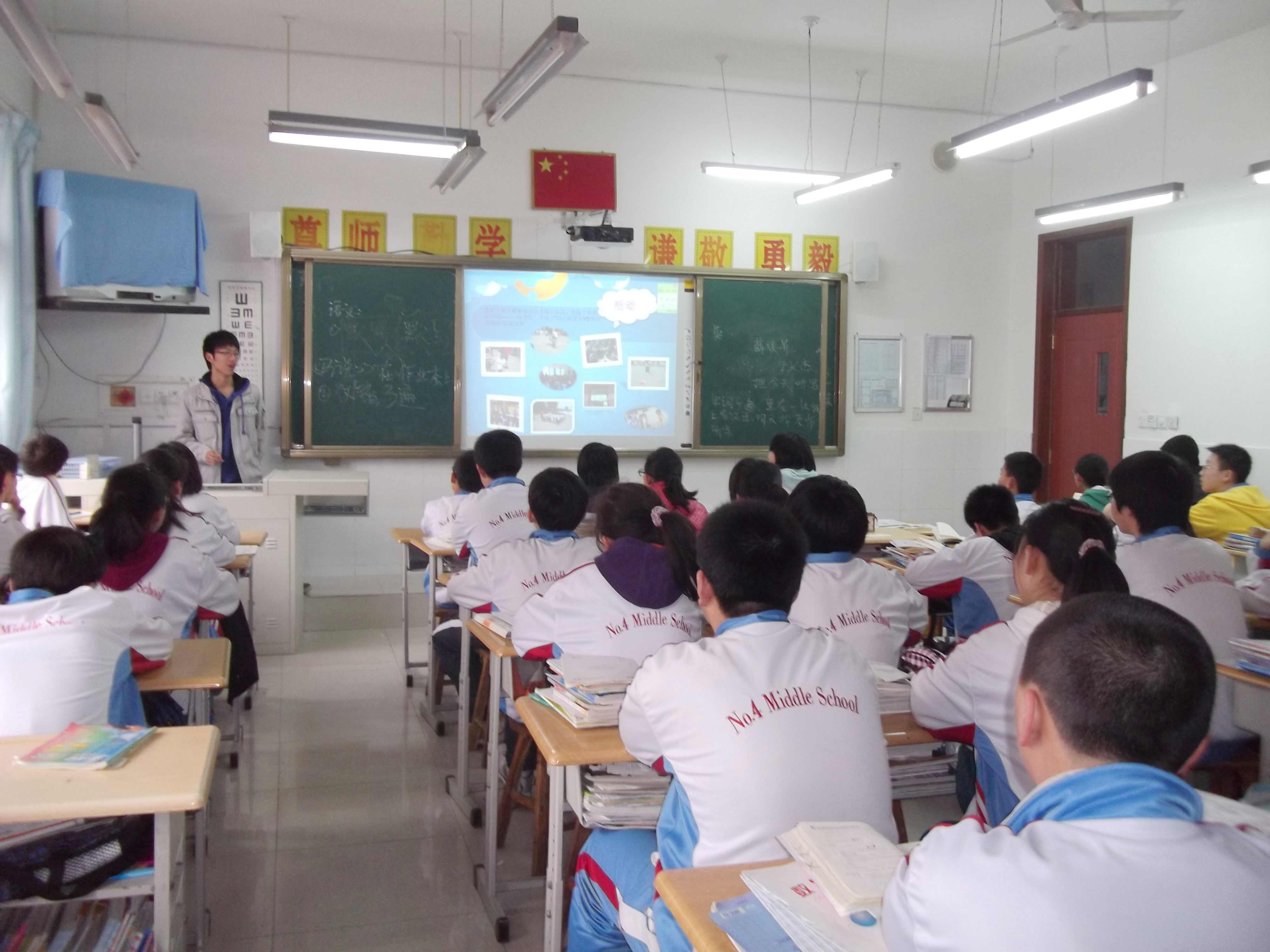 下午四点半左右,志愿者们来到四中,在老师的引领下分别到初二3个班级进行了演讲。他们借助生动多变的幻灯片,结合自己的亲身经历,分别讲述了“同心圆”计划西部支教地区的生活卫生条件、自然环境、民风民俗、教学情况以及支教过程中的一些感人瞬间,在真切传达义务支教内涵的同时,也激发了中员工们的责任心与爱心。现场气氛十分活跃,同学们都沉浸在大哥哥大姐姐们的演讲中,并不时爆发出阵阵掌声和笑声,在一边旁听的老师们对志愿者们的演讲也频频点头称赞。最后,在《我们都一样》的歌声中,志愿者们对那段支教生涯进行了精辟的总结,本次第二课堂活动也缓缓落下帷幕。临行前,同学们都依依不舍地希望志愿者们以后再来。课后,“同心圆”计划与四中校团委老师商讨了双方签订长期合作协议的细节问题,并将于近期正式签订合作协议。