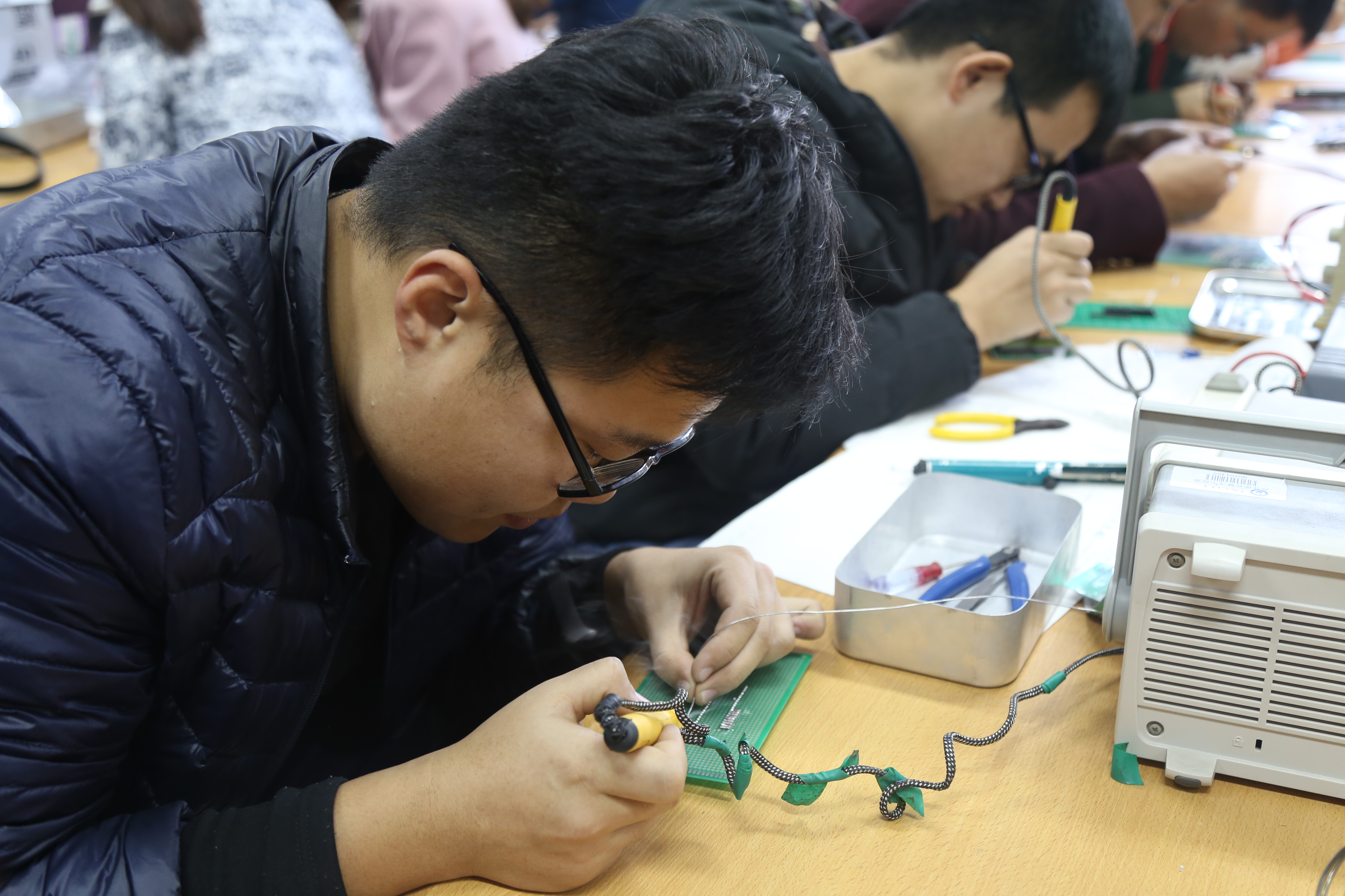 天气很冷,员工们却都将大衣脱下放在前方的实验台上。他们右手攥着电烙铁,左手持焊锡,将焊锡融化成银色的点,点连成线,在电路板上“绘制”早已设计好的电路,电路板上时时冒出缕缕白烟。赛后,选择B组题目的山东科技大学的单恒表示:“B组题目较为容易,但是还是出现了一些想象不到的问题。本来很简单的问题,我们却因为一个特别微小的错误纠结了很久,比如说排阻放反了。我的感受是以后做事还是要认真、细心一点。”