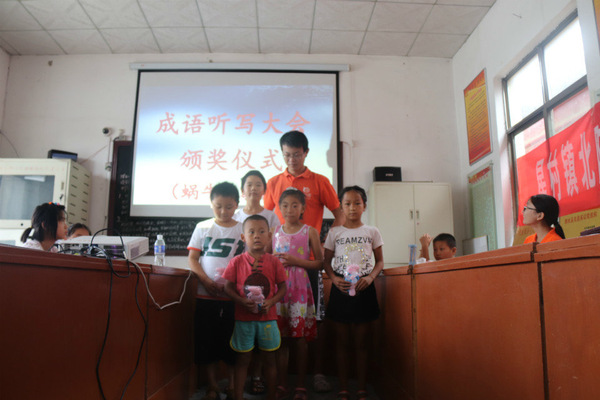 听写环节,由刘娜读出成语并解释成语所蕴含的意义,孩子们听完后在事先分发好的纸上写下成语。听写完毕,支教队队员根据孩子们的年龄及听写状况以百分制进行打分,同时选出获奖者,并由支教队队长管增嘉为获奖员工颁奖。最终,张明珠获得一等奖,潘静、冯文希、杜明龙获得二等奖,张佰振等五名员工获得三等奖,其余员工均获得参与奖。