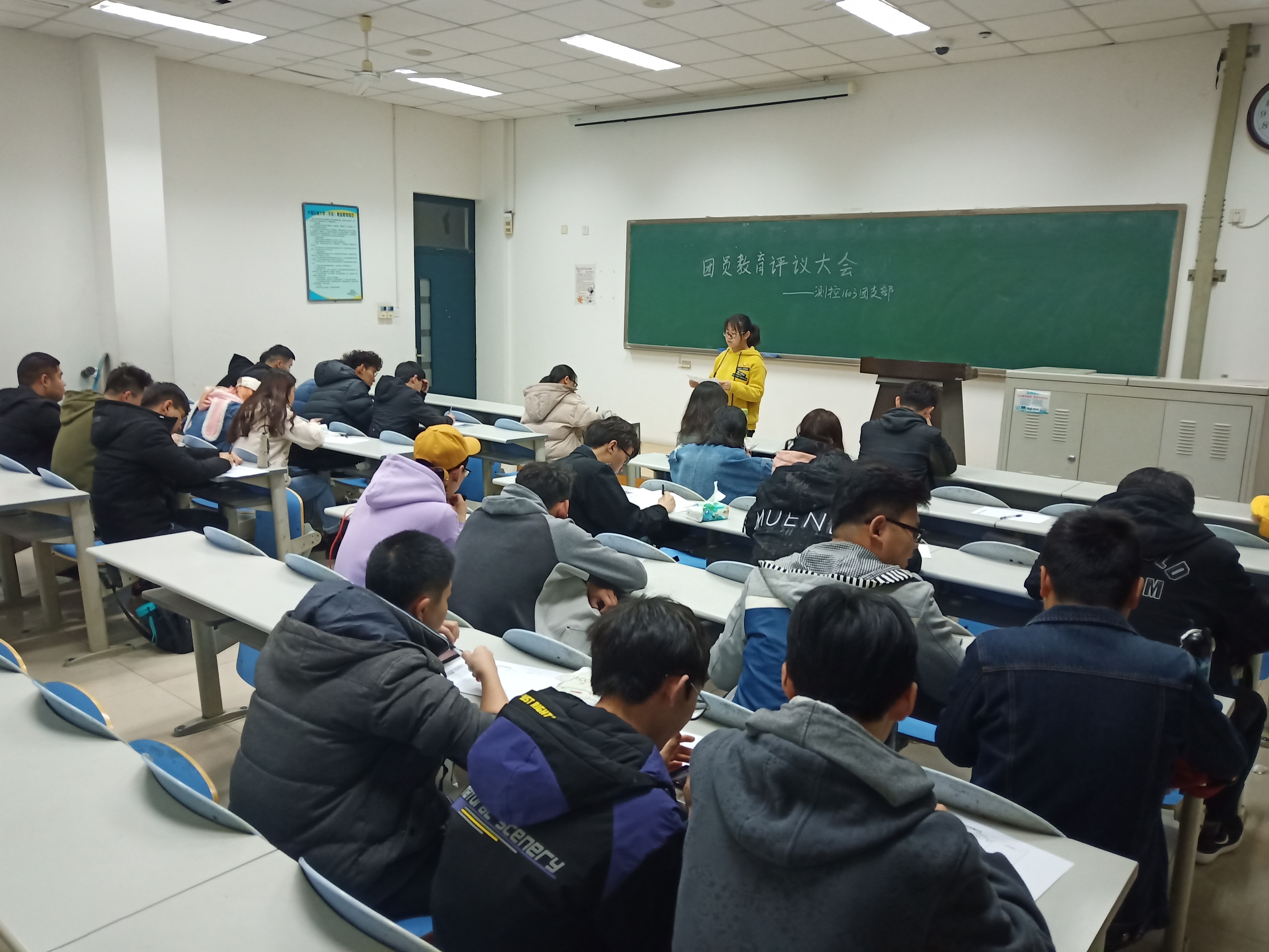 3月12日晚,测控1603班团支部于南堂楼403教室举办2019年第一次团员评议大会,测控1601班团支书郑林子、测控1602班团支书刘政以及测控1603班全体团员参加。