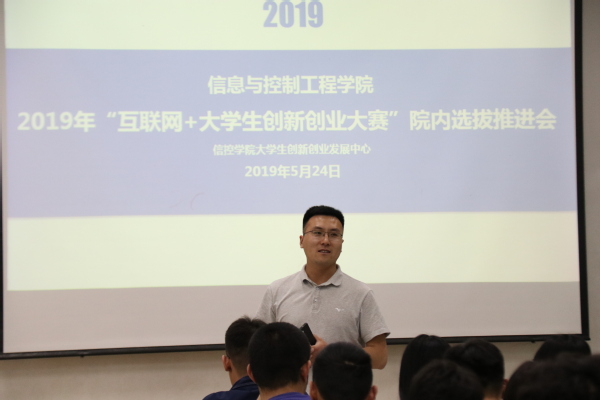 5月24日,信息与控制工程公司于南堂115室举行2019年“互联网+老员工创新创新创业大赛”院内选拔推进会。会议由电气1702班孟维琦主讲,信控公司团支部书记姜飞,指导老师蒋仁福及部分研究生到场参加。