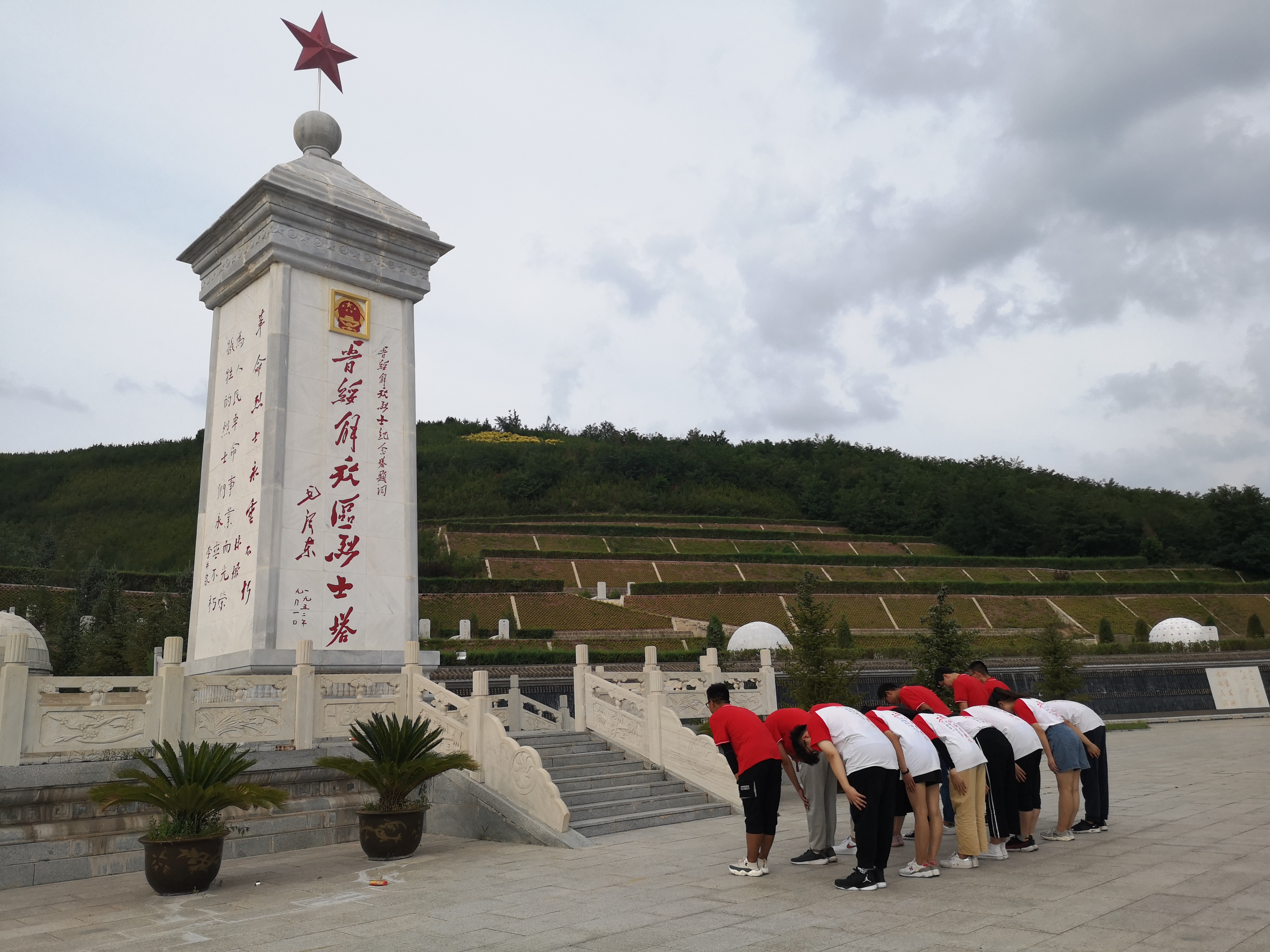 下午队员们来到了四.八空难发生地点——兴县黑茶山参观四.八烈士纪念馆。陵园背靠青山,松柏环绕,面对延河,庄严肃穆,借助自然地势,依坡而建,台阶共分三层,每层17个台阶,象征遇难的17人。队员们拾级而上进入纪念馆,听讲解员详细介绍四.八空难的经过与在空难中牺牲的王若飞,叶挺等13名“四八”烈士。参观完毕,队员们来到安葬有1000余名革命烈士的晋绥革命烈士陵园,其中绝大部分属于无名烈士,以序号为列,唯有每一座碑体上方镌刻的一颗鲜红的五星,见证着红军烈士对党和革命事业的热忱。蓝天白云下,全体队员列队站在烈士塔前,集体默哀致敬。随后队员陆续轻轻摆上菊花,向逝去的英雄们鞠躬致敬。
