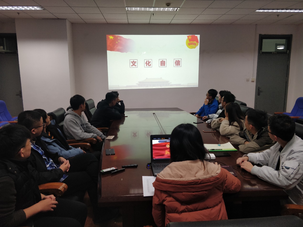 会议伊始,团支书李超群介绍了本次团日活动的主题背景及意义。我国作为四大文明古国之一,有着悠久的历史和灿烂的文化。在文化融合加剧的今天,中国传统文化更应为中国社会各界所重视与扶持。我们须知,传统文化是一个民族发展的不竭动力,是文明的创造力所在,只有立足于优秀传统文化之根,才能保证中华民族的持续健康成长。随后,参会团员共同学习关于文化自信的含义、底气和重要论述,观看由中国文化软实力研究中心主任张国祚讲解文化自信的视频。深刻理解习近平总书记所说:“文化自信,是更基础、更广泛、更深厚的自信,是更基本、更深沉、更持久的力量。”最后,参会团员逐一发言,展示自己的家乡文化特色。大家来自五湖四海,来自全国各地不同的地域。不同的地域,不仅带给了我们些许新奇,同时也造就了依附于不同地域的鲜明的地方文化。