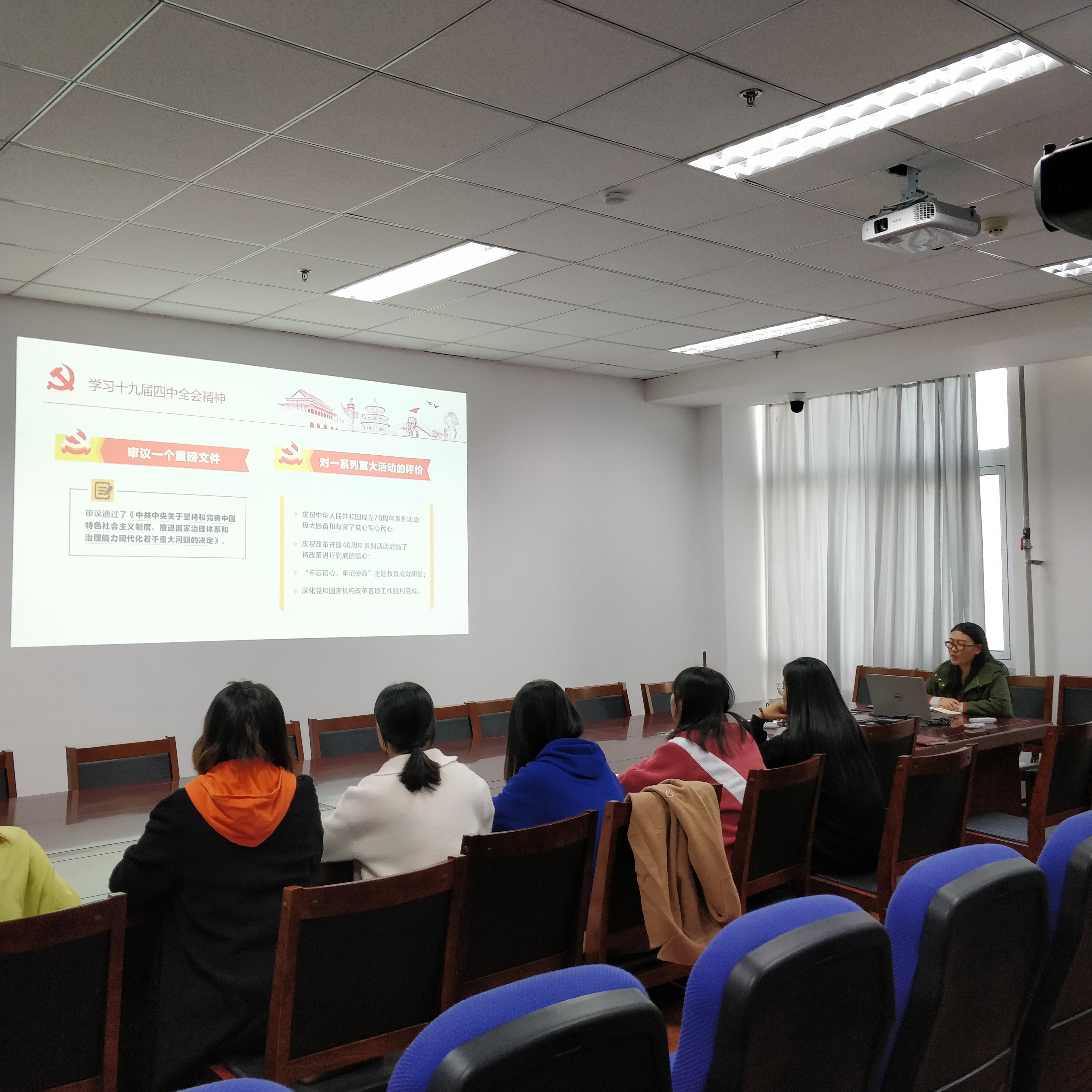本次学习专题会主要分三个环节。会议伊始,高一鸣同志带领大家学习了《中国共产党第十九届中央委员会第四次全体会议公报》,传达了十九届四中全会精神,解读了党的十九届四中全会公报关键词。高一鸣强调,青年党员在实现中华民族伟大复兴的中国梦的历史进程中担负着重大责任和使命,党员同志要积极营造良好思想舆论氛围,为贯彻落实党的十九届四中全会精神提供强有力保障。接下来由支部成员对《党的十九届四中全会〈决定〉学习辅导百问》一书中“十三个显著优势以及十三个坚持与完善”部分内容进行朗读。大家铿锵有力的声音中传达出自己要切实增强政治自觉性和历史使命感,听党话,跟党走的决心。最后,为更进一步加深支部党员对全会精神的理解,全体成员一同观看了“朝闻天下”和“焦点访谈”两个解读精神视频,观看完后支部党员潘倩男表示:“我们要毫不动摇坚持党的领导,持之以恒加强党的建设,不忘初心、牢记使命,以实际行动增强‘四个意识’、坚定‘四个自信’、坚决做到‘两个维护’。”