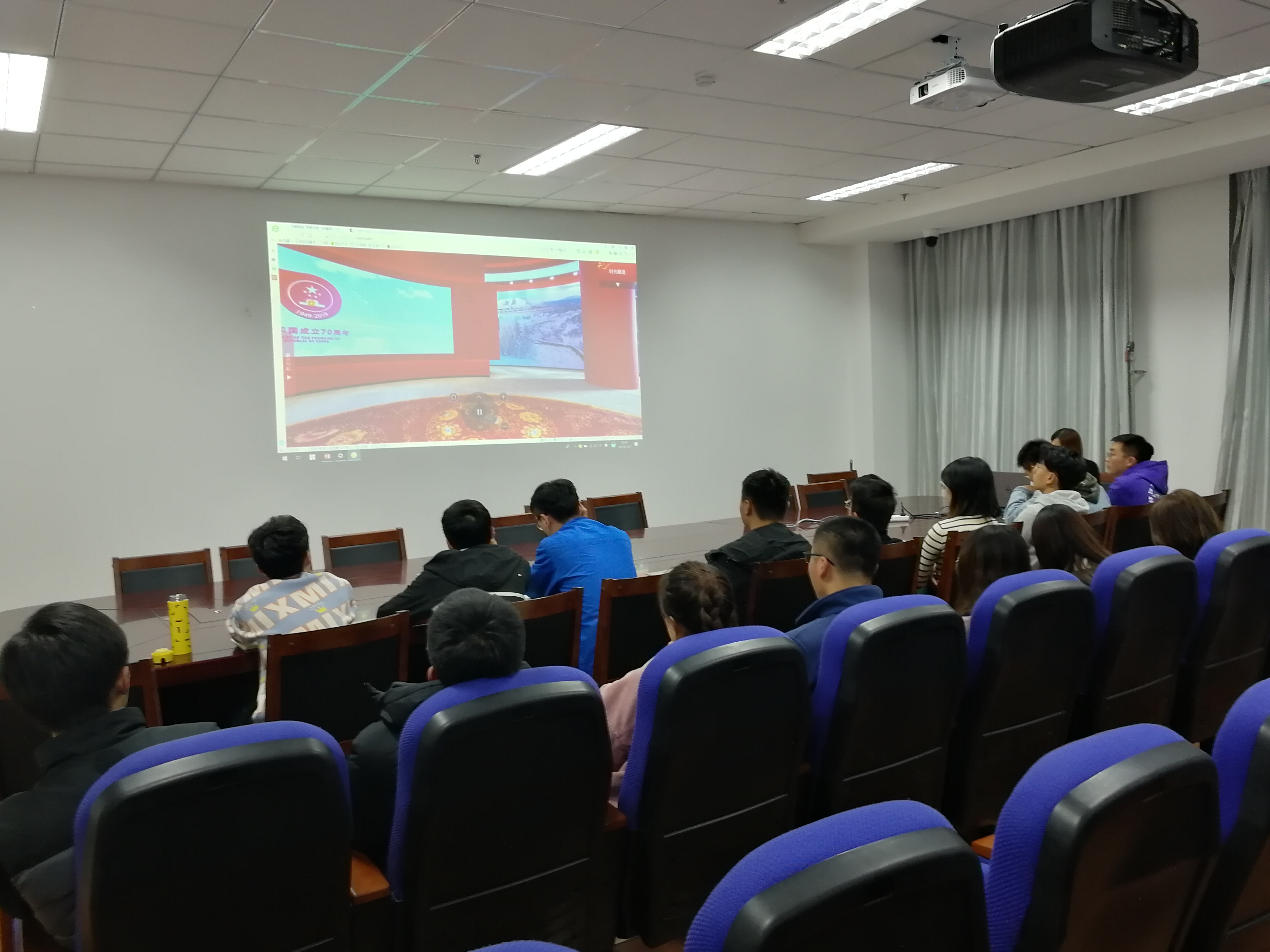晚上7点,全体与会成员开始观看专题节目,节目通过先进代表张富清、李连成、黄文秀、唐真亚、李萌、隋耀达和嫦娥四号工程党组织代表叶培建、孙泽洲等优秀共产党员的现场访谈、分享入党初心等形式,着力讲好新时代新故事,用平凡故事讲述深刻道理,用模范事迹诠释崇高理想,展现了共产党人不忘初心、牢记使命的执著坚守,彰显了共产党人信仰坚定、心系群众、勇于担当、甘于奉献的崇高品格。接下来,王健同志带领与会成员观看了新中国成立70周年大型成就网上展馆。展馆以新媒体平台为依托,运用全景观展技术,采取多媒体互动叠加图文、音频等形式,生动再现展览全貌。50年代的婚房、60年代的第一颗原子弹、70年代的高考现场、80年代的春晚和四大名著、90年代的女足风采等等有年代的标志事件在百姓心中根深蒂固,重温了记忆中的美好,身临其境感受新中国成立70周年的伟大历程和辉煌成就。