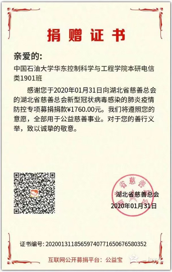 新型冠状病毒肺炎疫情牵动人心,据悉,131日,公司本研一体化(电气信息类)1901班自发组织募捐,向湖北省慈善总会新型冠状病毒肺炎疫情防控专项捐款1760元,收到来自湖北省慈善总会颁发的电子版“捐赠证书”,全班25人为疫情防控做出应有的贡献,众志成城,共同抗击疫情。