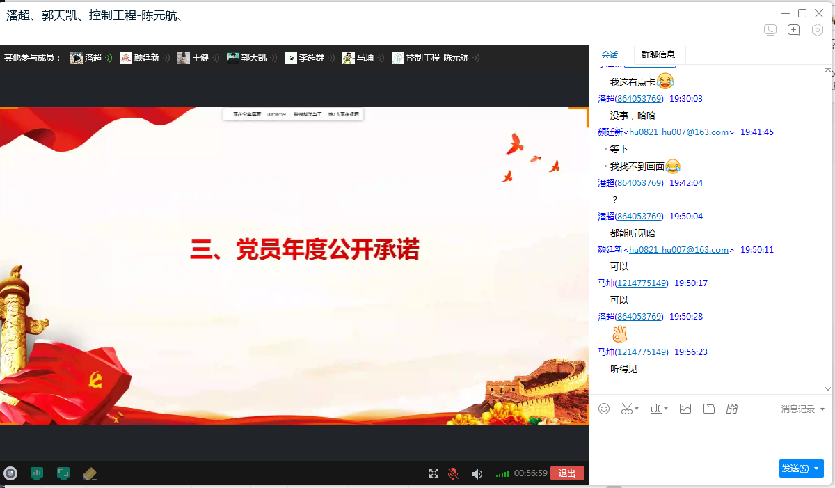第三环节为党员年度公开承诺,与会党员皆进行公开承诺,结合疫情防控期间要求,与党员承诺严格遵守公司规定,带头做好学习规划,加强与同学的交流,主动承担防控责任,发挥党员的模范带头作用。