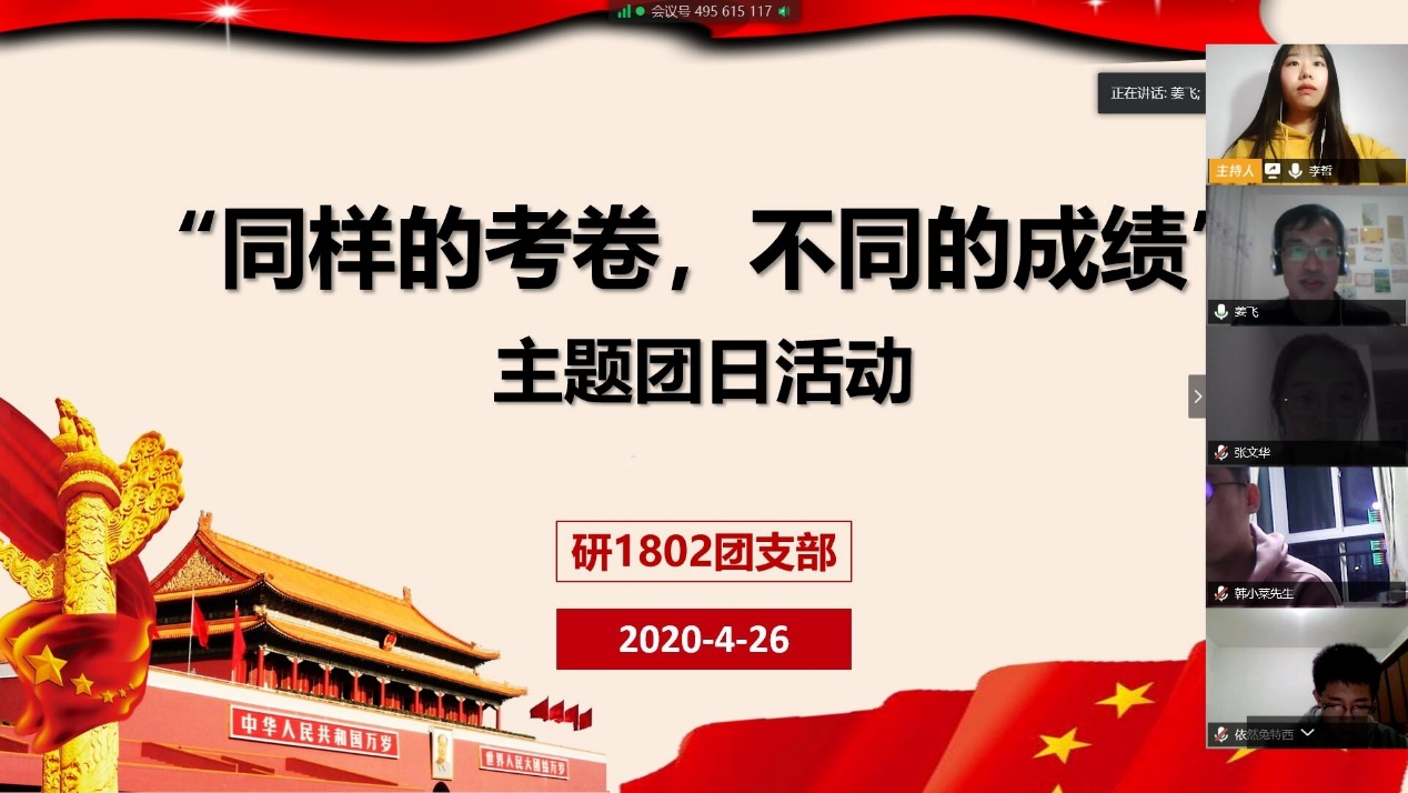 为了引导团员们深刻理解全国一盘棋、集中力量办大事的国家制度和治理体系优势,深刻感受中国共产党的坚强领导、中国特色社会主义制度的显著优势,控制研18-2团支部于426日晚开展“同样的考卷,不同的成绩” 线上主题团日活动,研究生辅导员姜飞和控制研18-2团支部成员参与此次活动。
