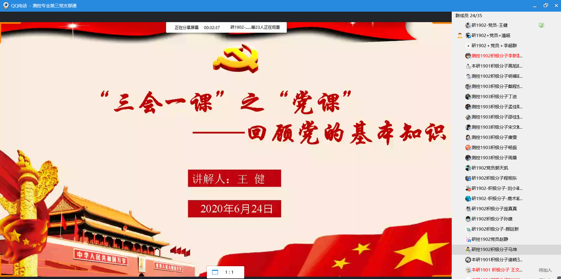 按时上好党课,是党内政治生活的重要载体,是提高党的创造力凝聚力战斗力的重要途径,是我们党注重思想建党、严密党的组织、增强党的创造力凝聚力战斗力的鲜明体现和制度安排。为此我院测控专业第三党支部于2020年6月24日晚上7点30分在QQ群内开展党员讲党课活动。活动由党员王健主持并担任主讲人,正式党员(一人请假)和部分入党积极分子参与此次活动。