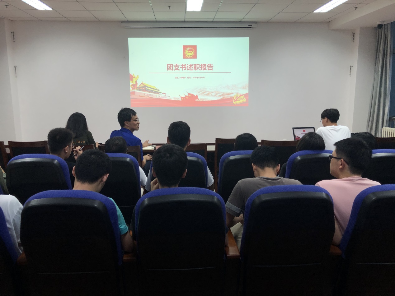 团支部书记郭敬宇围绕2019-2020学年履职尽责情况为同学们解读了过去一年以来团支部的具体工作:在思想建设方面,依托青年大学习、学习强国、主题团课等理论课程形式,建设学习型支部提高同学们的政治理论素养;在组织建设方面,支委会成员分工明确、通力合作,贯彻 “三会两制一课”制度,保证支部各项工作公平公正进行;在活动开展方面,支部开展十余次主题团日活动,多次参与公益捐款项目。在述职过程中,郭敬宇带领同学们共同回顾了近一年的丰富多彩的团组织生活。同时,支部同学发挥自身特长,积极参与竞赛,为构建创新创业型活力团支部共同努力,现已有二十余人参与各类竞赛活动。最后,郭敬宇同志对于近一年的团支部活动进行总结和反思,强调支部活动的创新性和多样性有待提高。郭敬宇指出,在接下来的工作中,团支委将根据同学们的需求来开展丰富多彩的创新创业型团日活动以及志愿服务类团日活动,并进一步明确了团小组在今后共同学习共同科创中的定位。最后,姜飞老师作总结性发言,他充分肯定了过去一年以来支部做出的努力与取得的成果,并对今后支部的发展提出意见。鼓励同学们参加竞赛,积极科研,提高创新能力,为同学们的人生规划提出建议,要求同学们做为社会主义事业建设添砖加瓦的优秀青年。