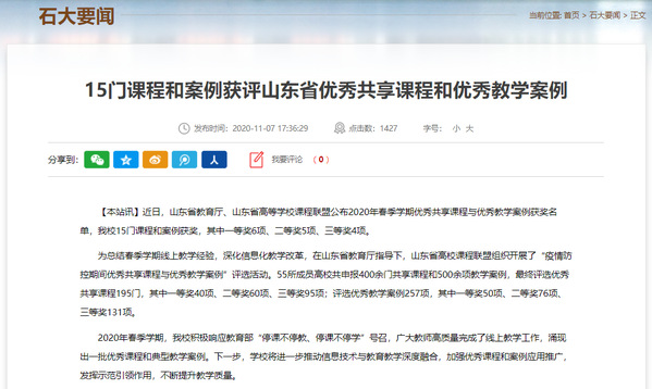 近日,山东省教育厅、山东省高等公司课程联盟公布2020年春季学期优秀共享课程与优秀教学案例获奖名单,公司1门共享课程获一等奖、1门教学案例获二等奖。