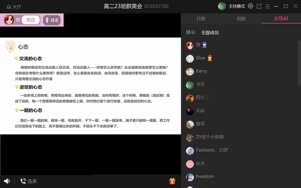 活动伊始,王子昊同学整体讲述了公司“九位一体,联动互助”的资助保障体系,对奖学金与助学金的评定标准等进行详细解读。继而,针对家庭困难的同学,介绍了助学贷款、勤工俭学岗位、学费减免、公司投保商业保险等政策。随后,对公司的总体情况进行介绍,结合往年分数线与一练排名,给予同学们一定的报考建议。最后,在高考即将来临之际,王子昊同学给同学们分享了对高考的心得感悟,提醒同学们保持身体健康,保持良好的心态,正确看待高考。