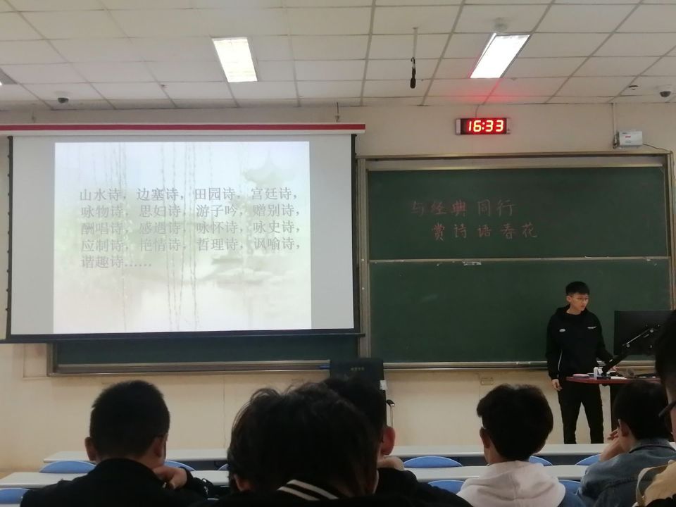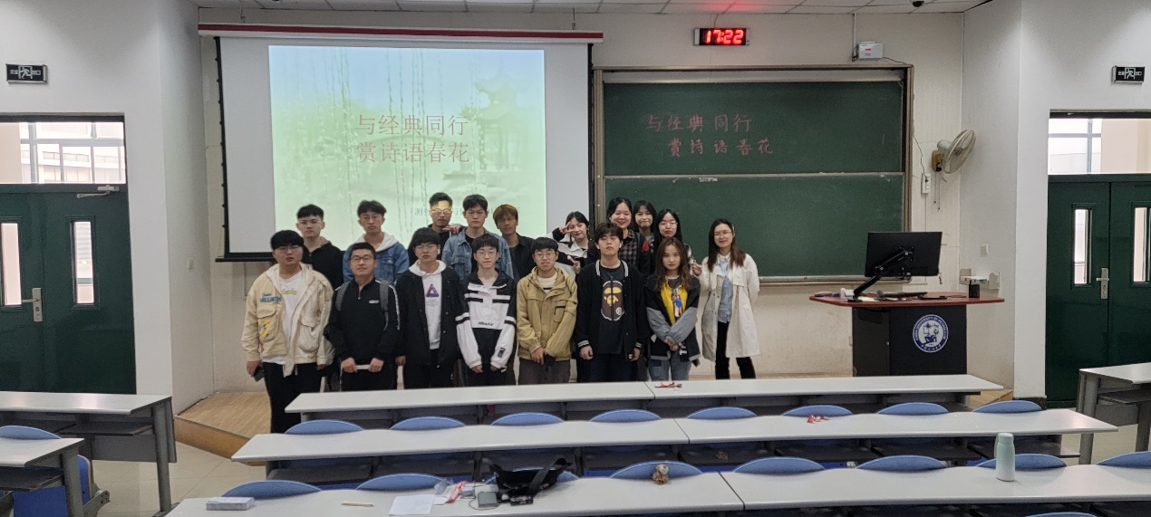 为了弘扬中国优秀传统文化,增强同学们对传统诗文化的了解与热爱,测控1901班团支部于425日在东环206举行“与经典同行,赏诗语春花”主题团日活动。此次活动由宣传委员李彬主持,支部全体成员参加。