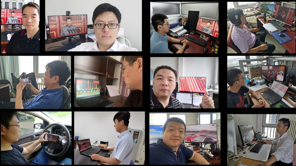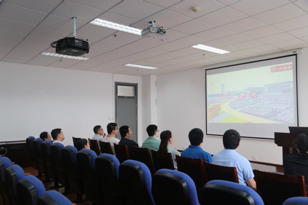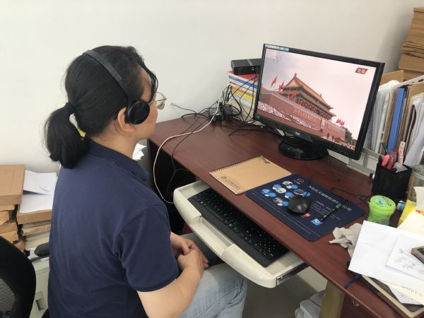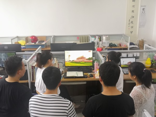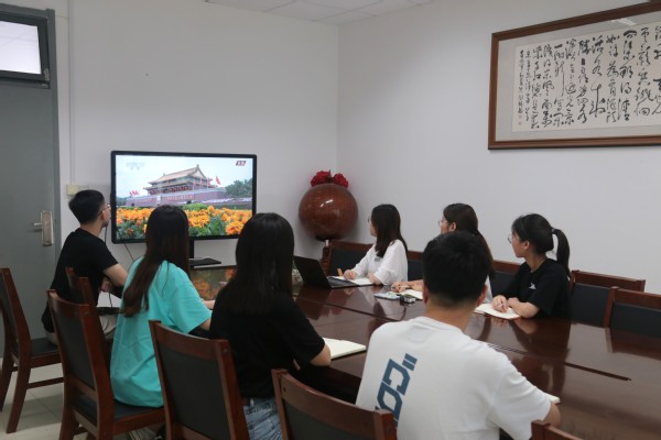 公司机关党支部全体成员于工科E1329会议室内共同收看网络直播。伴随着庄严肃穆的国歌,全体成员起立向画面内升起的国旗行注目礼。
